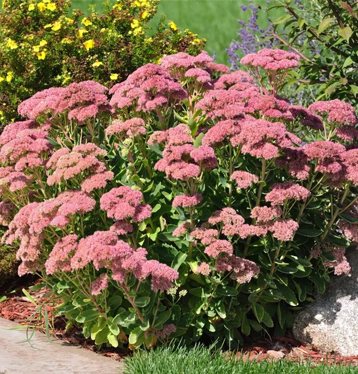 Das Großes Garten-Fettblatt 'Herbstfreude' (Sedum telephium) ist eine buschige, aufrechte Staude, die von September bis Oktober dunkelrosafarbene, in Dolden angeordnete Blüten bildet. Seine dickfleischigen Blätter sind hellgrün. An einem sonnigen Standort mit durchlässigem, nährstoffreichem Boden erreicht es gewöhnlich eine Höhe von ca. 70 cm und wird ca. 60 cm breit. Das Großes Garten-Fettblatt 'Herbstfreude' ist gut frostverträglich.