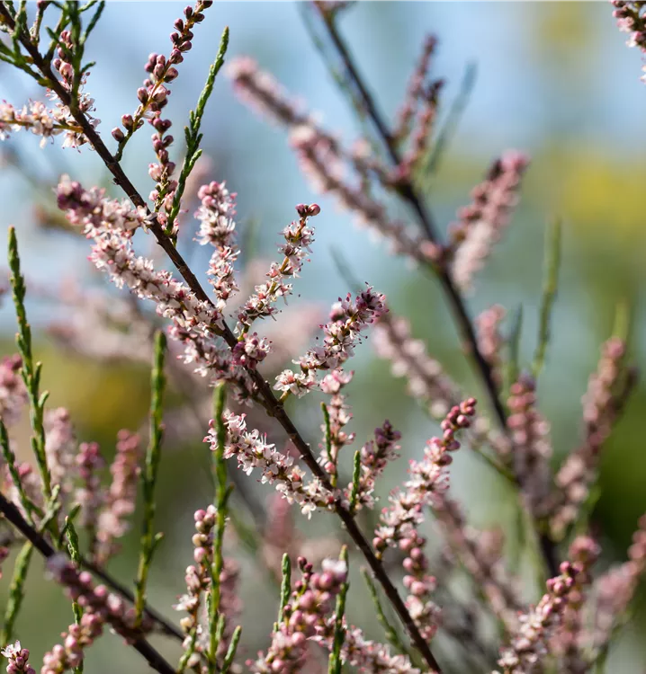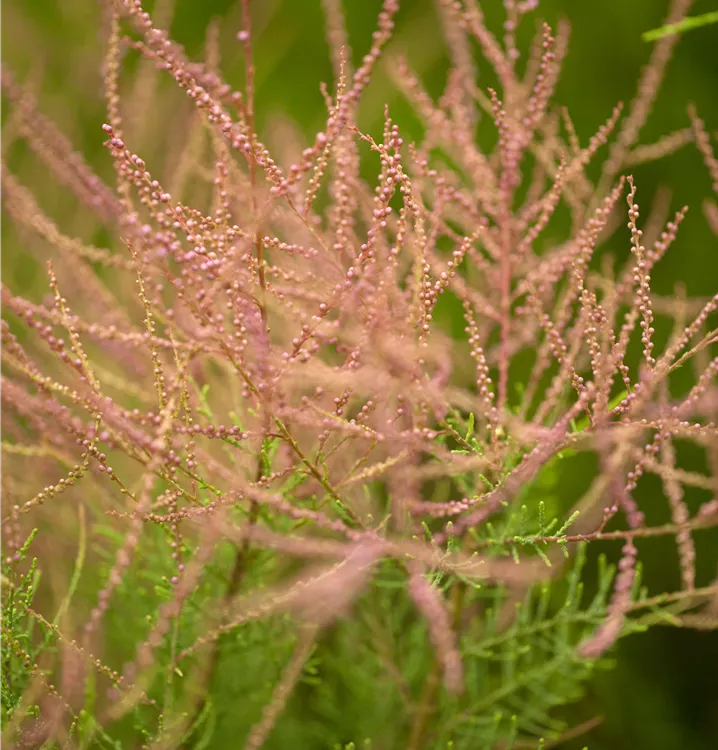 Die hellrosafarbenen Blüten der Kleinblütige Tamariske erscheinen in Trauben von Mai bis Juni.