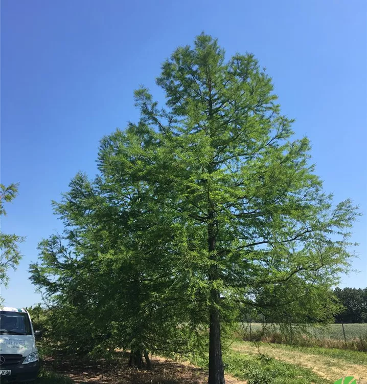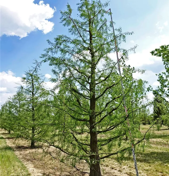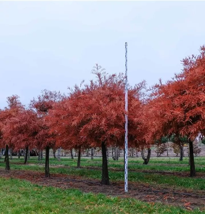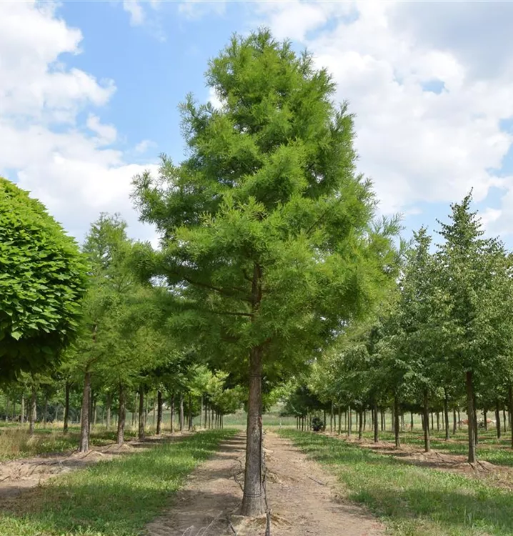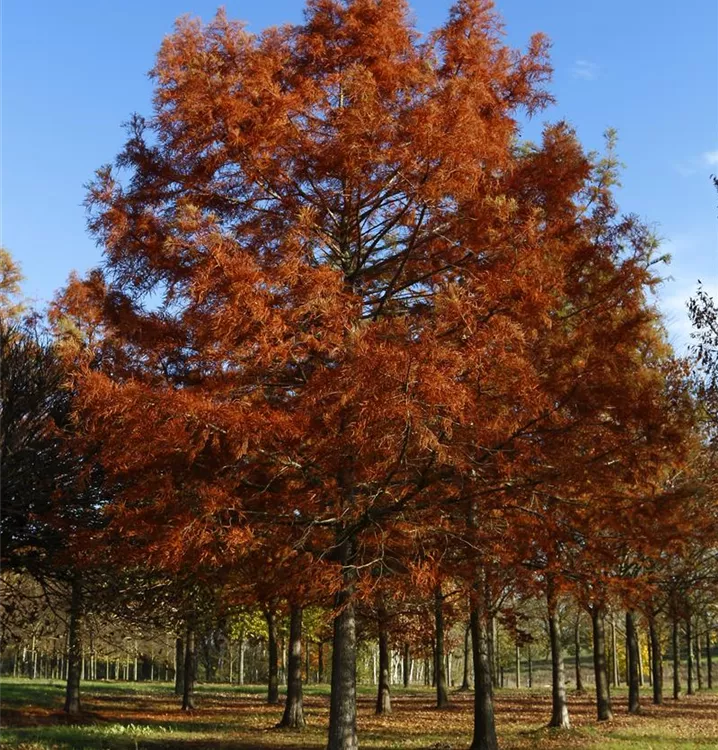 Die Sumpfzypresse (Taxodium distichum) ist ein Großbaum, welcher kegelförmig wächst und gewöhnlich eine Höhe von ca. 40 m und eine Breite von ca. 10 m erreicht. Ihre nadelförmigen Blätter haben eine hellgrüne Färbung. Sie verwandeln sich im Herbst in ein schönes Rot-braun. Dekorative braune Zapfen zieren Taxodium distichum ab Oktober. Dieses Gehölz ist gut frostverträglich. Sie bevorzugt durchlässigen, nährstoffreichen, feuchten bis nassen Boden in sonniger windgeschützter Lage.