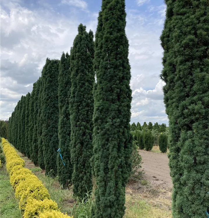 Die Schmale Säuleneibe 'Fastigiata Robusta' (Taxus baccata) ist ein Großstrauch, welcher säulenförmig, straff wächst und gewöhnlich eine Höhe von ca. 8 m und eine Breite von ca. 2,5 m erreicht. Ihre nadelförmigen Blätter haben eine mittelgrüne Färbung. Dekorative rote Zapfen zieren Taxus baccata 'Fastigiata Robusta' ab September. Dieses Gehölz ist gut frostverträglich.Sie bevorzugt durchlässigen, kalkhaltigen, nährstoffreichen Boden in sonniger bis halbschattiger Lage.