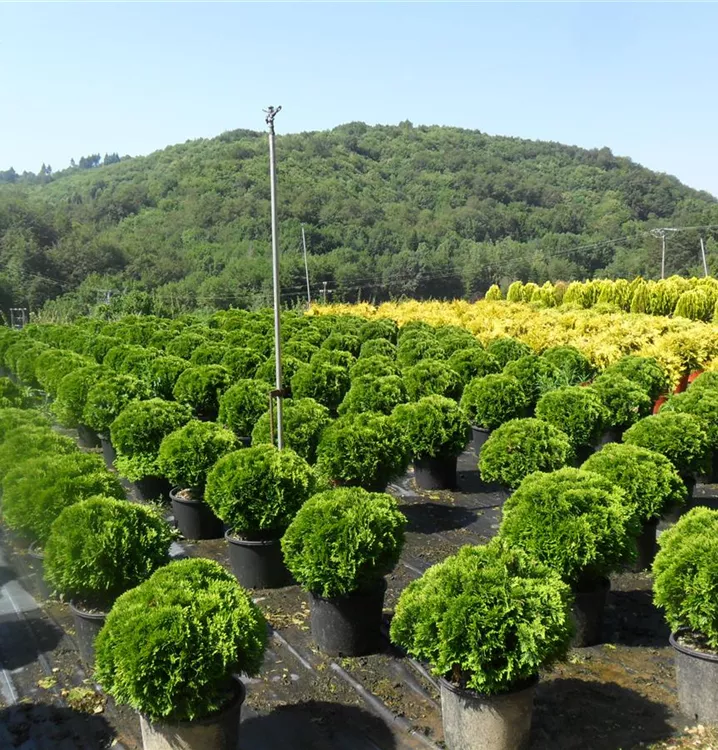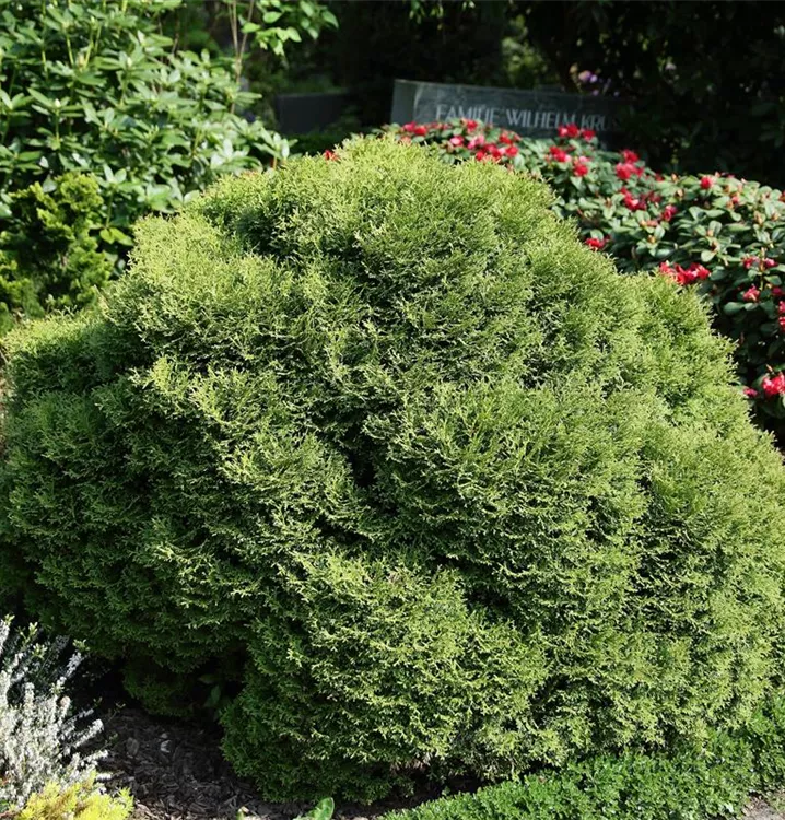 Der Zwergiger Kugel-Lebensbaum 'Danica' (Thuja occidentalis) ist ein Zwergstrauch, welcher dicht, kugelförmig wächst und gewöhnlich eine Höhe von ca. 60 cm und eine Breite von ca. 1 m erreicht. Seine schuppenförmigen, glänzenden Blätter haben eine mittelgrüne Färbung. Sie verwandeln sich im Winter in ein schönes Bronze. Dekorative braune Zapfen zieren Thuja occidentalis 'Danica' ab Oktober. Dieses Gehölz ist gut frostverträglich.Er bevorzugt durchlässigen, nährstoffreichen Boden in sonniger bis halbschattiger Lage.