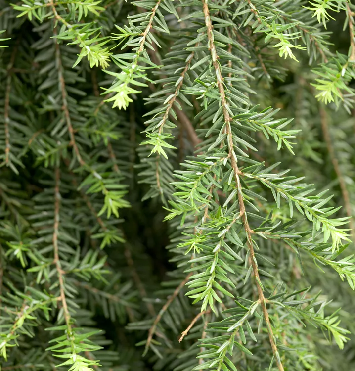 Die Triebe von Tsuga canadensis 'Pendula' sind braun-gelb.