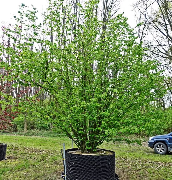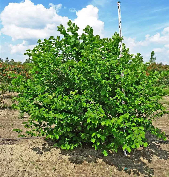 The Hazel (Corylus avellana) is a broad, multi-stemmed large shrub that produces yellow flowers arranged in catkins. They appear from March to April. Brown nuts emerge from these from September. The Hazel also has roundish, medium green leaves. Its bark is brown and smooth. In a sunny to shady location with well-drained, nutrient-rich soil, it usually reaches a height of approx. 7 metres and grows to a width of approx. 7 metres.