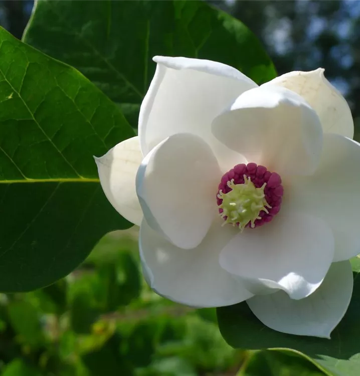 The Small-flowered magnolia (Magnolia sieboldii) is a loose, funnel-shaped large shrub with decorative, red, elongated fruits. These exude a pleasant fragrance. It produces white, cup-shaped flowers from June to July. The Small-flowered magnolia also has egg-shaped, blue-green leaves. In a semi-shady, wind-protected location with humus-rich, loose, nutrient-rich soil, it usually reaches a height of around 6 metres and is around 4 metres wide.