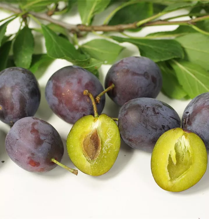 The Plum 'Schönberger Zwetsche' (Prunus domestica) produces purple-violet, juicy and easily stone-dissolving fruits. They are oval and have a sweet, aromatic flavour. Well-drained, humus-rich soil and a sunny to semi-shady location create the ideal conditions for a high-yielding harvest from August. Its white flowers are a beautiful sight. With its bushy, upright and broad growth, the Plum 'Schönberger Zwetsche' grows to around 3 metres high and 3 metres wide.