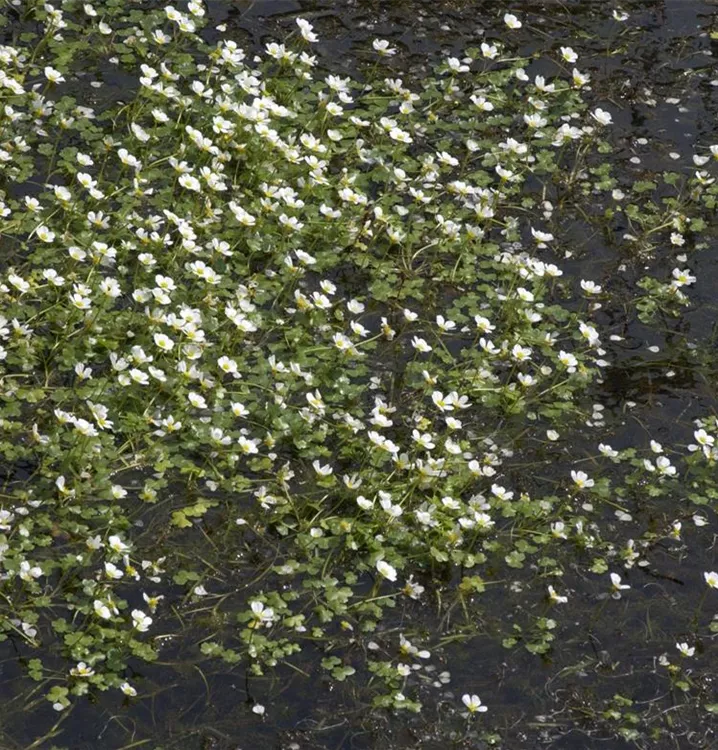 With its dark green leaves, the Water crowfoot (Ranunculus aquatilis) is an extremely decorative aquatic plant that is particularly suitable for areas such as pond edges, streams and ponds. White flowers appear from May to June. It prefers humus-rich, lime-free soil in a sunny to semi-shady position. The Water crowfoot is well tolerant of frost. The flat, creeping plant usually reaches a height of approx. 8 cm.