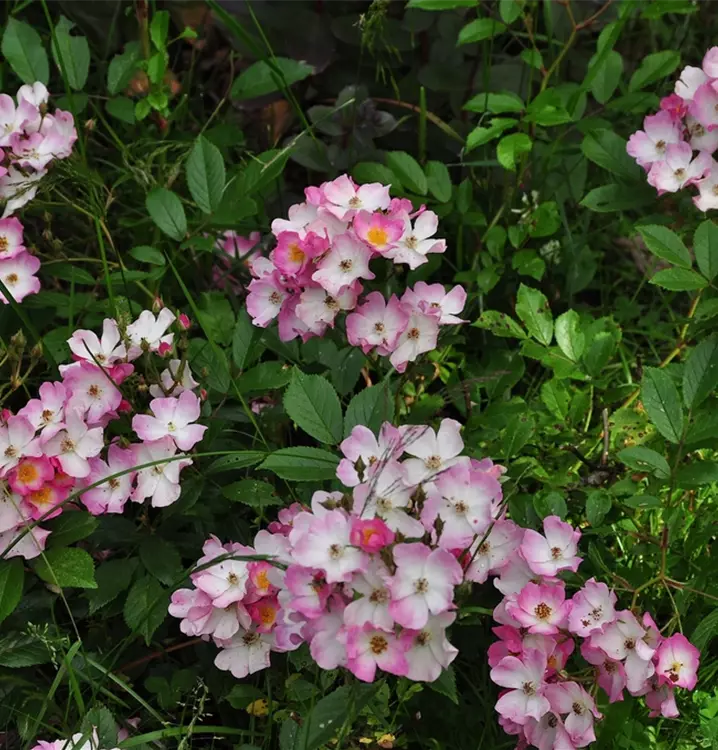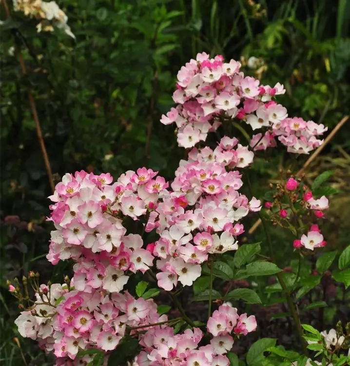 The Rose 'Ballerina' (Rosa) is a rich-flowering rose that plays a special role in the garden. The numerous flowers are pink-white and appear from June to September. Their wonderful fragrance unfolds particularly on sunny, warm days. With its bushy and overhanging growth, this small shrub grows up to 1 metre high and 1 metre wide.