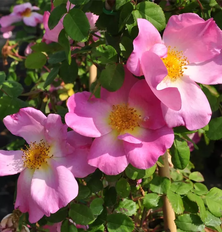 The Rose 'Marguerite Hilling' (Rosa) is a rich-flowering rose that plays a special role in the garden. The numerous semi-double flowers are pink-red in colour and appear from June to July. With its bushy and upright growth, this shrub grows up to 2 metres high and 2 metres wide.