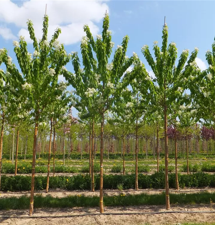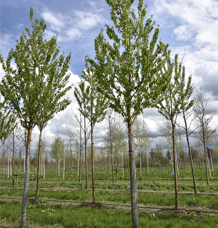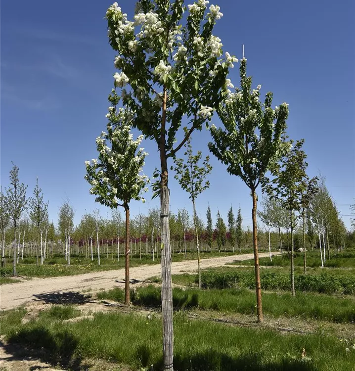 The Manchurian cherry 'Amber Beauty' (Prunus maackii) is a small tree that produces white flowers arranged in panicles and umbels. They appear from April to May. These produce black, round fruits from August. The Manchurian cherry 'Amber Beauty' also has egg-shaped, light green leaves. Its bark is copper-brown in colour, rolling and shiny. In a sunny to semi-shady location with well-drained, nutrient-rich, sandy, loamy soil, it usually reaches a height of around 12 metres and is around 7 metres wide.