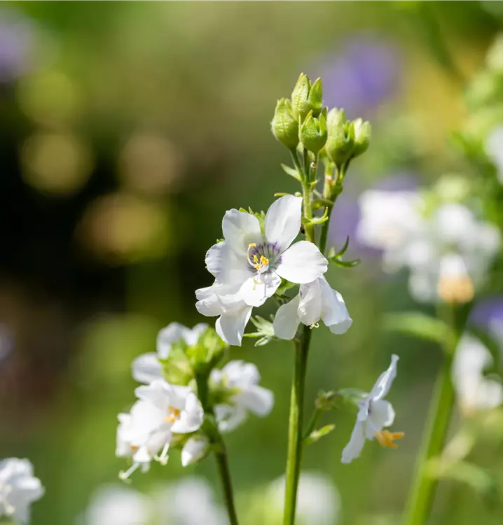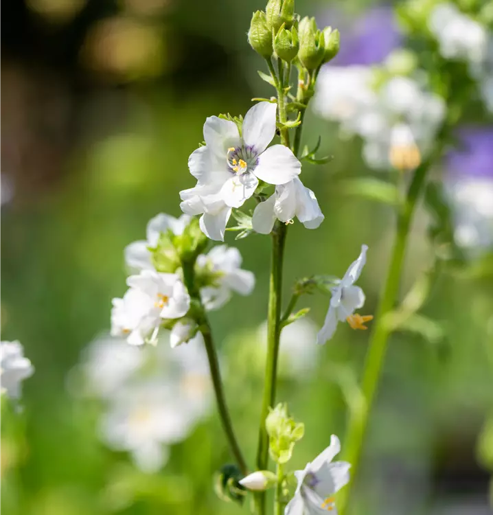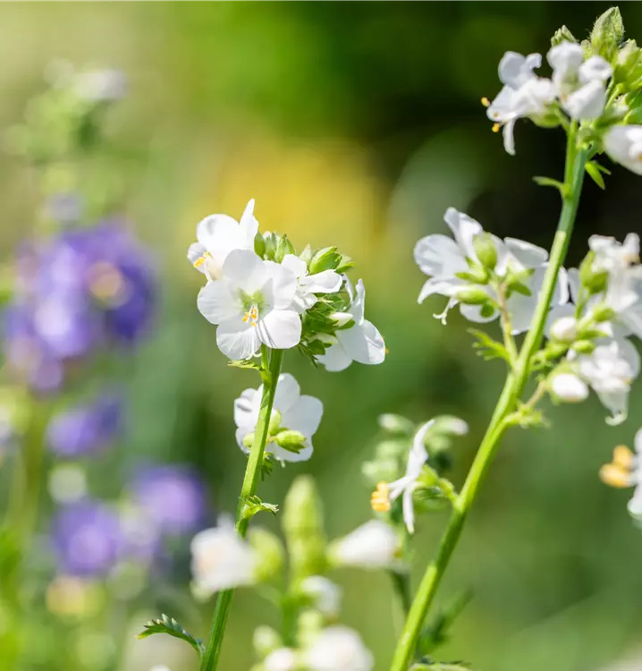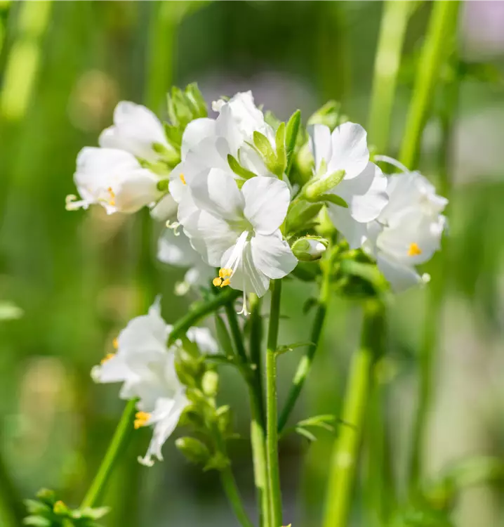 Polemonium caeruleum 'Album' forms funnel-shaped, white flowers from May. These exude a pleasant fragrance. With the right care, re-flowering from July to August.
