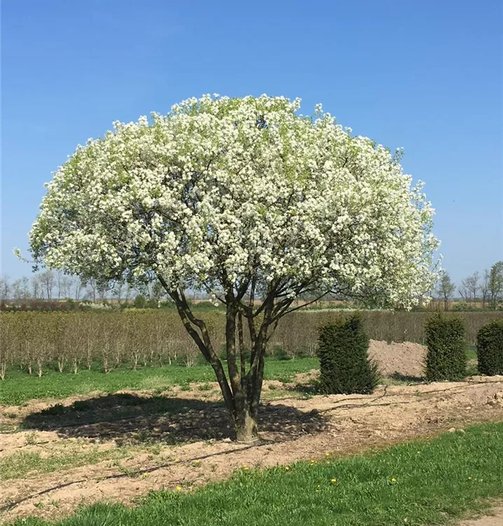 The Mahaleb Cherry (Prunus mahaleb) is a sprawling, multi-stemmed large shrub with decorative, black, round fruits. It produces white flowers arranged in umbels from April to May. In a sunny location, it usually reaches a height of around 10 metres and is around 10 metres wide. The Mahaleb Cherry makes no particular demands on the soil.
