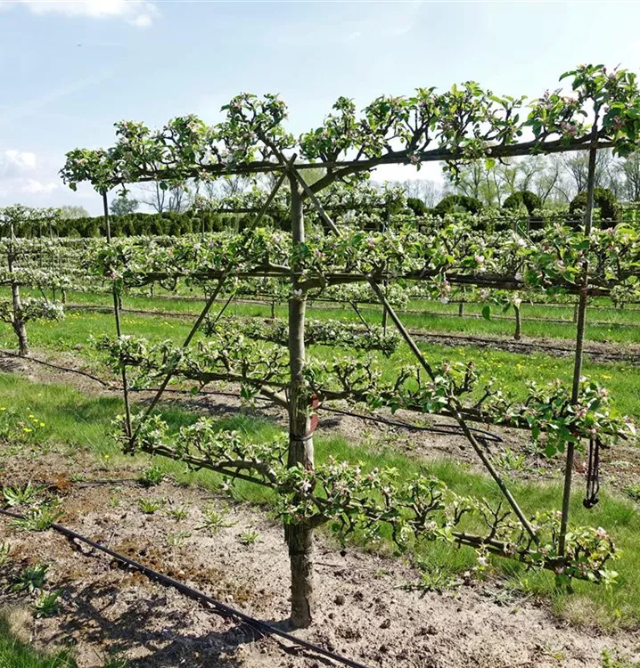 The Apple 'Goldparmäne' (Malus domestica) produces yellow-red, medium-sized, medium-firm and juicy fruits. They have a spicy, juicy flavour. Well-drained, nutrient-rich soil and a sunny to semi-shady location create the ideal conditions for a high-yielding harvest from September. Its light pink flowers are a beautiful sight. With its upright and broad growth, the Apple 'Goldparmäne' grows to around 4 metres high and 3 metres wide.