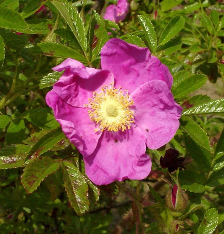 The Rose (Rosa rugotida) is an upright, tight small shrub that produces pink-coloured, cup-shaped flowers. They appear from June to July. The Rose also has shiny, pinnate, dark green leaves. In a sunny location, it usually reaches a height of around 1 metre and grows to around 1 metre wide. The Rose makes no particular demands on the soil.
