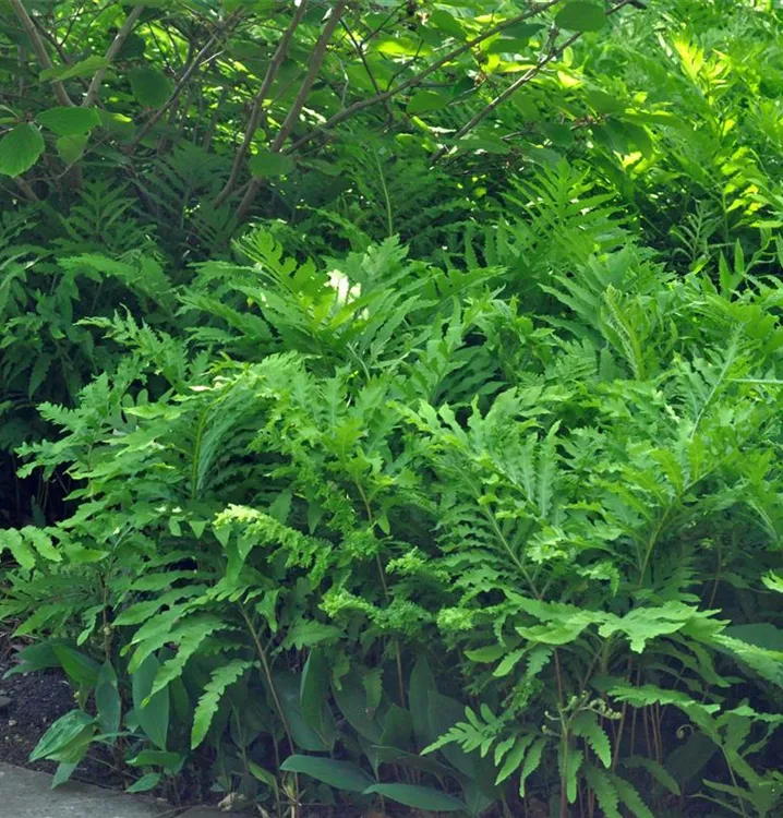 The Sensitive fern (Onoclea sensibilis) with its feathery, medium green leaf fronds is a decorative design element in the garden. It feels most at home in a semi-shady to shady location with well-drained, moist to wet soil. In favourable conditions, this hardy fern reaches a height of approx. 50 cm and grows up to 40 cm wide.