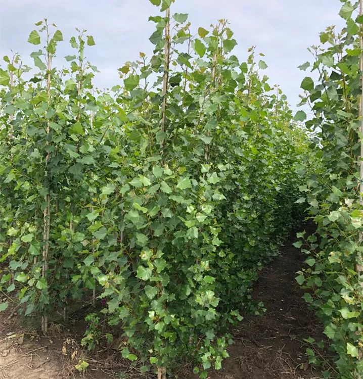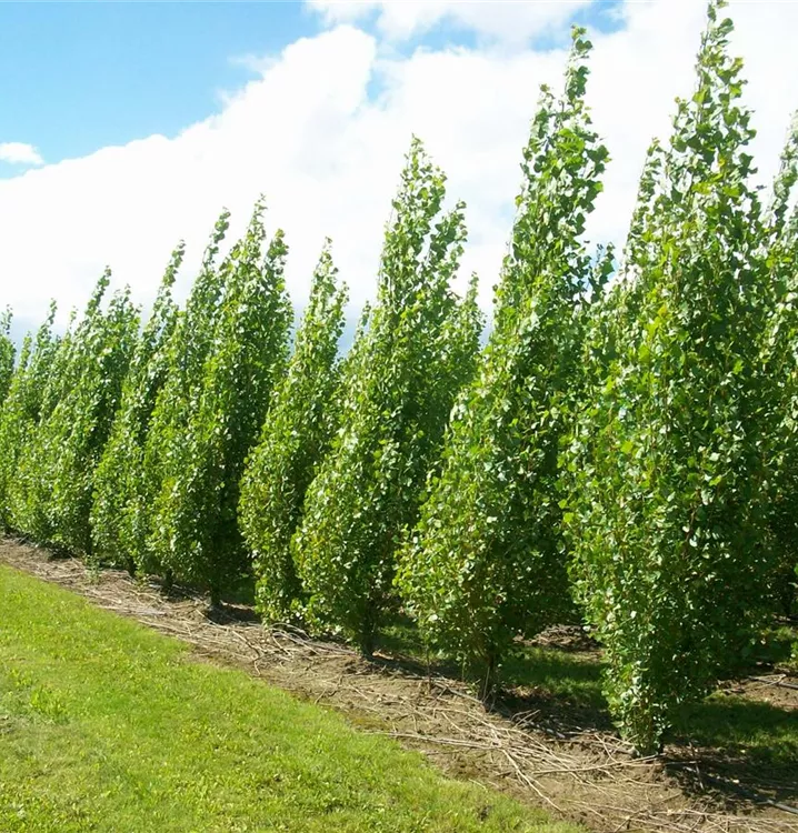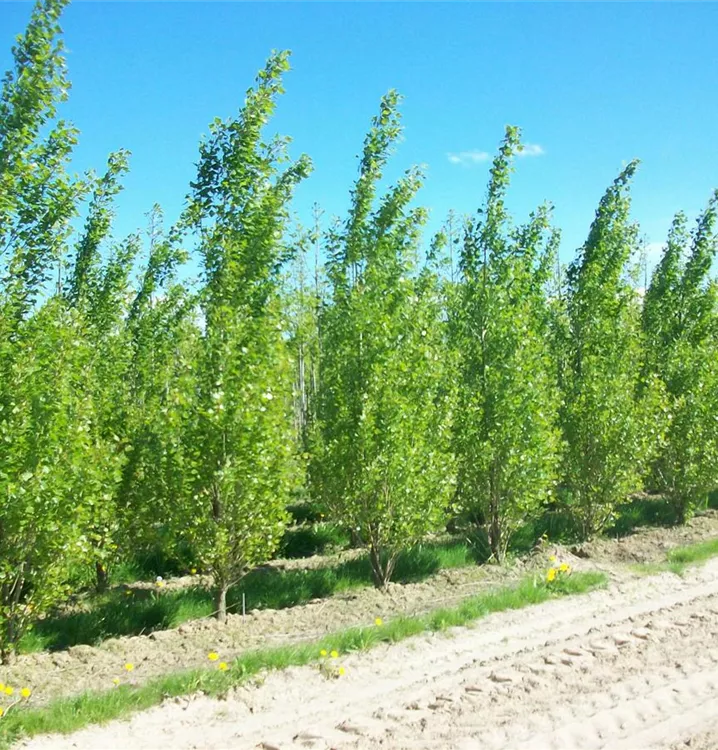 The Black poplar 'Italica' (Populus nigra) is an upright, columnar, slender large tree that produces purple-red flowers. They appear from March to April. These produce white fruits from May. The Black poplar 'Italica' also has shiny, diamond-shaped, light green leaves. Its bark is dark grey and longitudinally furrowed. In a sunny to semi-shady location with calcareous, loose, nutrient-rich soil, it usually reaches a height of approx. 30 metres and grows to a width of approx. 5 metres.