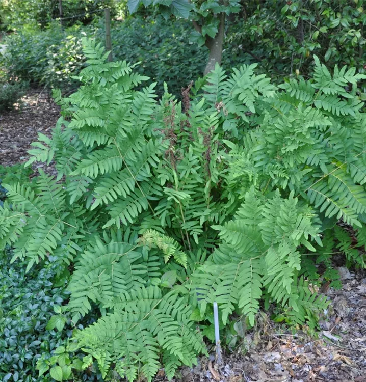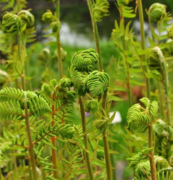 The Royal fern (Osmunda regalis) is a decorative design element in the garden with its feathery, medium green leaf fronds. The brown shoots are an interesting detail. It feels most at home in a semi-shady to shady location with humus-rich, slightly acidic soil. In favourable conditions, this hardy fern reaches a height of approx. 1.8 m and grows up to 1.2 m wide.