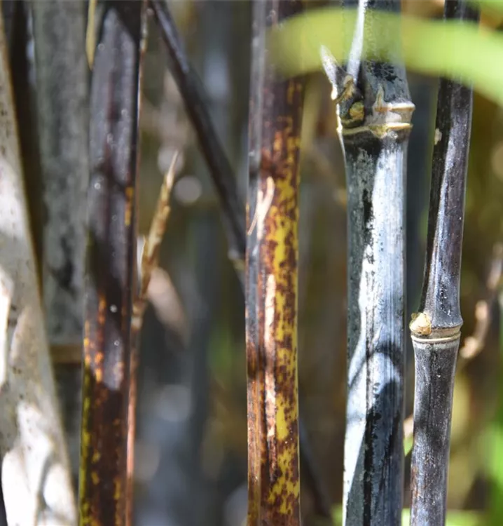 Black cane bamboo 'Punctata' is a large shrub that grows loosely and overhanging and can reach a height of 3 - 6 m and a width of 2 - 4 m.