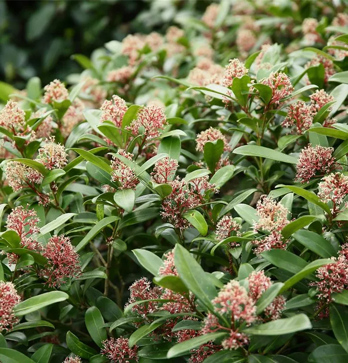 The Skimmia 'Rubella' (Skimmia japonica) is a bushy, compact small shrub that produces red flowers arranged in panicles with a strong fragrance. They appear from April to May. The Skimmia 'Rubella' also has leathery, lanceolate, dark green leaves. In a semi-shady to shady, wind-protected location with well-drained, humus-rich, acidic soil, it usually reaches a height of around 1 m and grows to around 1.5 m wide.