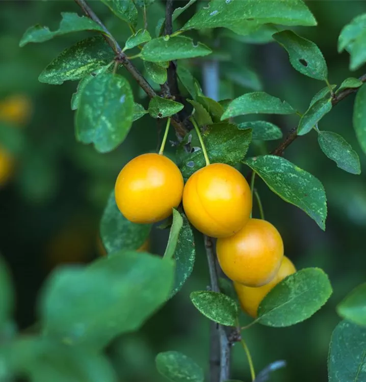 The Plum 'Mirabelle von Metz' (Prunus domestica) produces orange-yellow, easily stone-dissolving fruits. They have a sweet, aromatic flavour. Well-drained, humus-rich soil and a sunny to semi-shady location create the ideal conditions for a high-yielding harvest from August. Their white flowers are a beautiful sight. With its upright and slender growth, the Plum 'Mirabelle von Metz' grows to around 10 metres high and 5 metres wide.