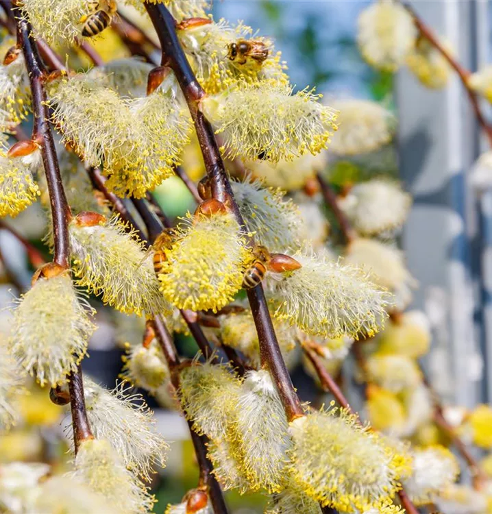 The Goat willow 'Pendula' (Salix caprea) is an overhanging small tree that produces silvery, catkin-shaped flowers with a light fragrance. They appear from March to April. In a sunny to semi-shady location with well-drained, moist to wet soil, it usually reaches a height of approx. 1.5 m and grows to approx. 1 m wide.
