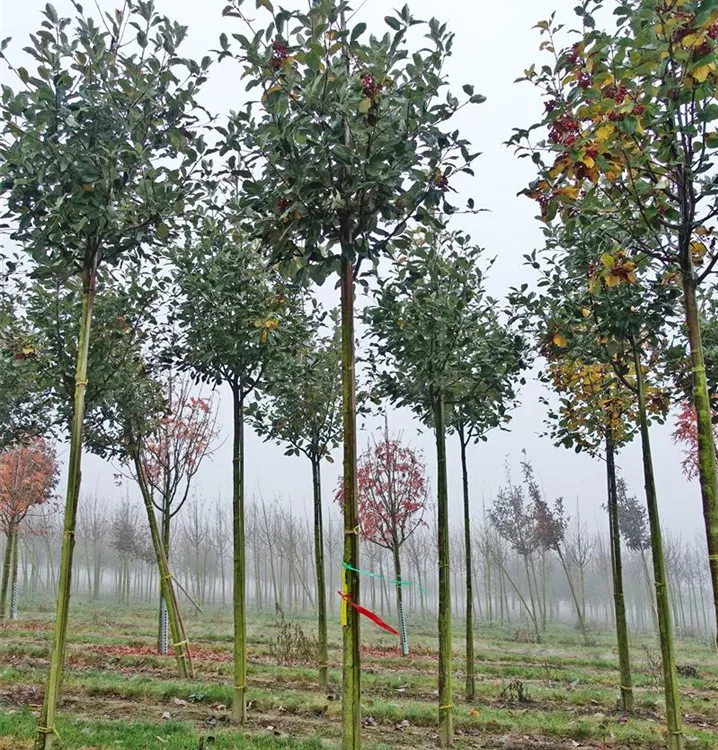 The Whitebeam (Sorbus aria) is a conical small tree with decorative, orange-red, round fruits. It produces white flowers arranged in umbrella clusters from May to June. In a sunny to semi-shady location with well-drained, calcareous soil, it usually reaches a height of around 18 metres and grows to a width of around 12 metres.
