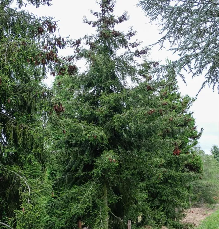 The Oriental spruce (Picea orientalis) is a large tree that grows in a conical shape and usually reaches a height of around 40 metres and a width of around 8 metres. Its needle-shaped, glossy leaves are dark green in colour. This shrub is well tolerant of frost and prefers well-drained, nutrient-rich soil in a sunny to semi-shady position.