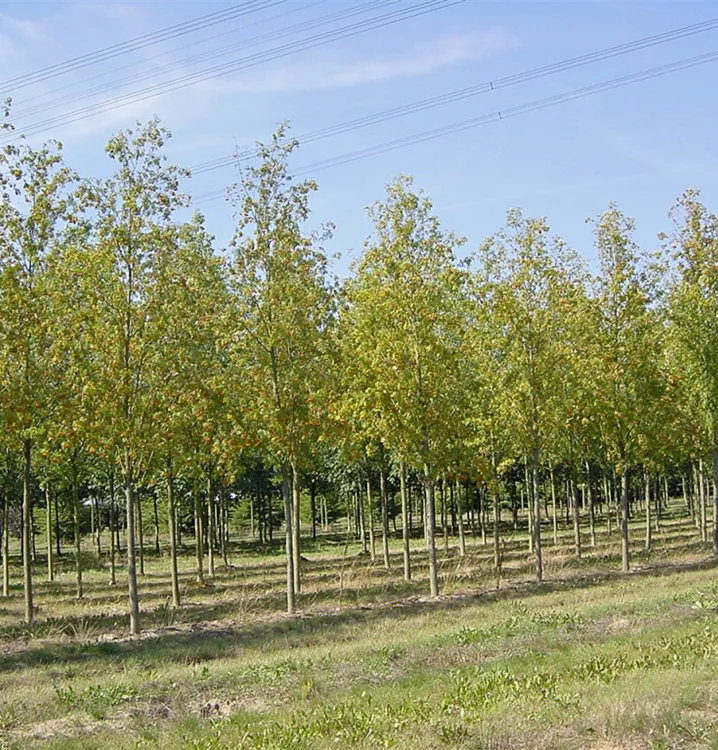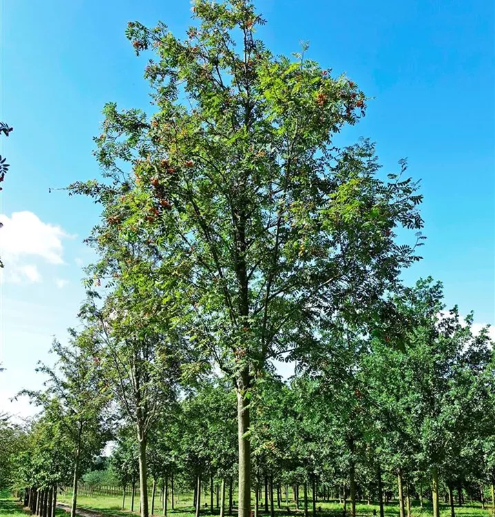 The Rowan 'Edulis' (Sorbus aucuparia) is a small ovoid tree with decorative, orange-red, round fruits. It produces white flowers arranged in umbels from May to June. The Rowan 'Edulis' also has pinnate, medium green leaves. In a sunny to semi-shady location with humus-rich, loose, nutrient-rich soil, it usually reaches a height of around 15 metres and grows to a width of around 7 metres.