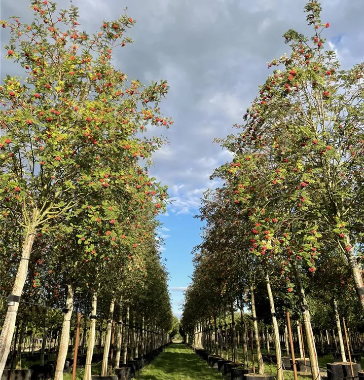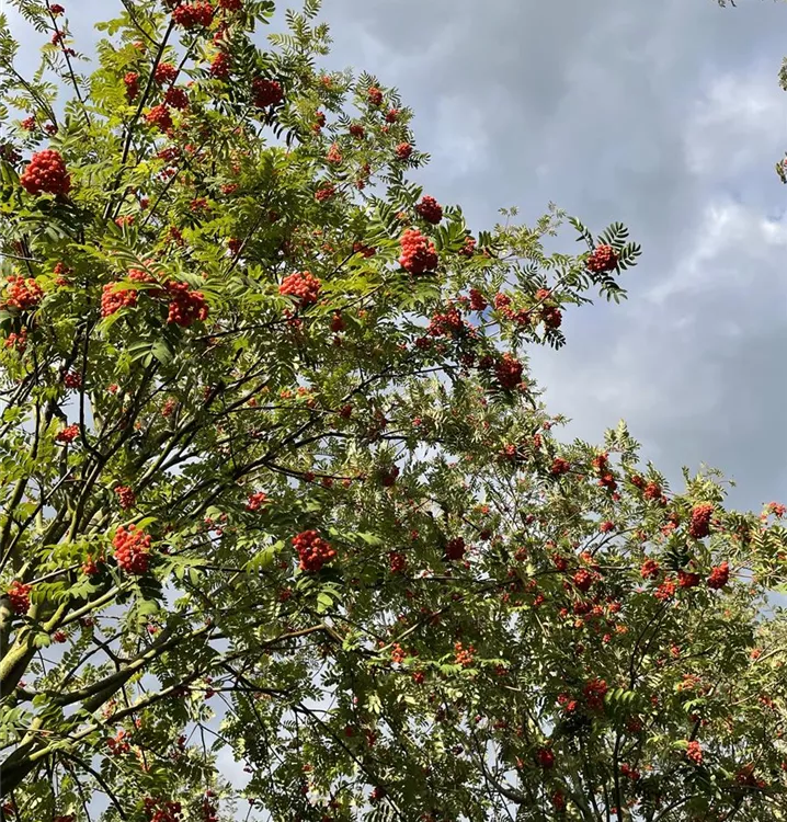 The Rowan 'Sheerwater Seedling' (Sorbus aucuparia) is an upright, ovoid, firm small tree with decorative, orange-red, round fruits. It produces white flowers arranged in umbels from May to June. The Rowan 'Sheerwater Seedling' also has pinnate, medium green leaves. In a sunny to semi-shady location with humus-rich, loose, nutrient-rich soil, it usually reaches a height of around 1.2 metres and grows to a width of around 5 metres.