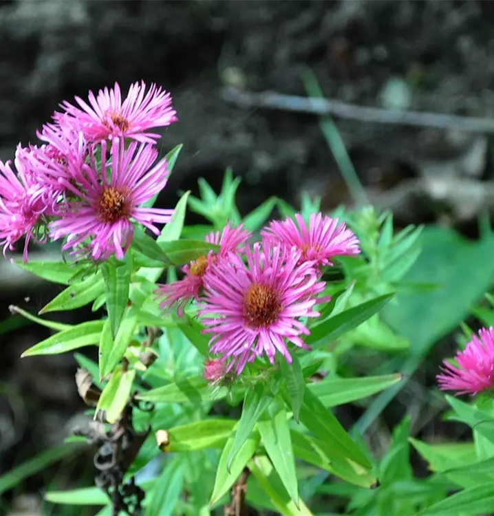 The deciduous leaves of New England aster 'Alma Pötschke' are dark green, lanceolate.