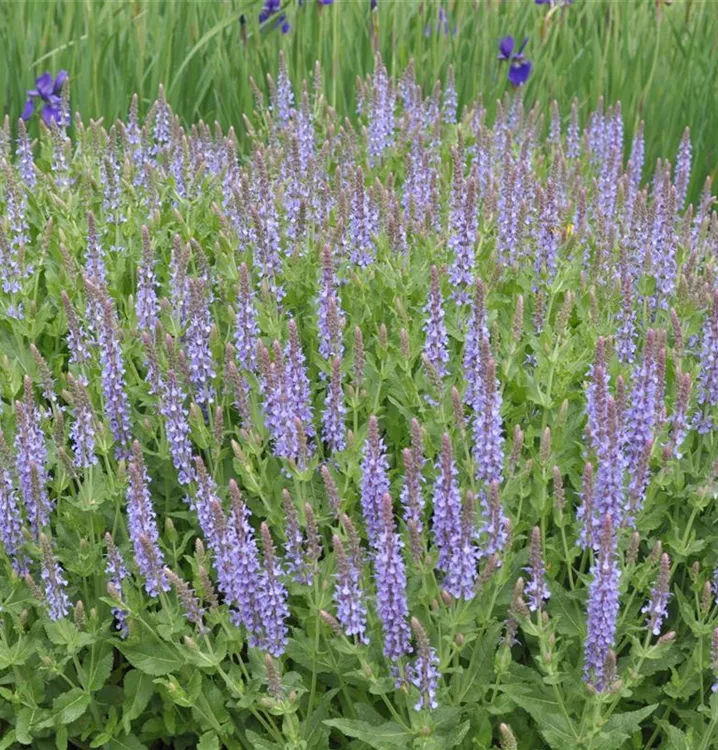 The Balkan clary 'Blauhügel' (Salvia nemorosa) is a bushy, upright perennial that produces blue, lip-shaped flowers arranged in panicles with a pleasant fragrance from June to September. Repeated flowering occurs in September with proper care. Its lanceolate leaves are medium green in colour. In a sunny location with well-drained, nutrient-rich soil, it usually reaches a height of approx. 50 cm and grows to a width of approx. 40 cm. The Balkan clary 'Blauhügel' is well tolerant of frost.