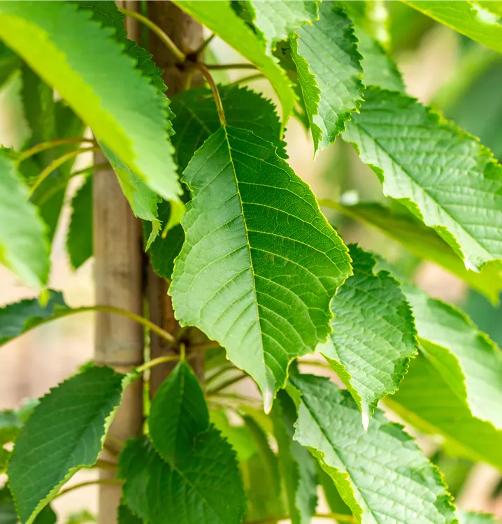 The deciduous leaves of the Wild cherry 'Hedelfinger Riesenkirsche' are medium green, ovate, alternate, serrated. They are about 10 - 15 cm in size. Wild cherry 'Hedelfinger Riesenkirsche' turns bright orange-red in autumn.