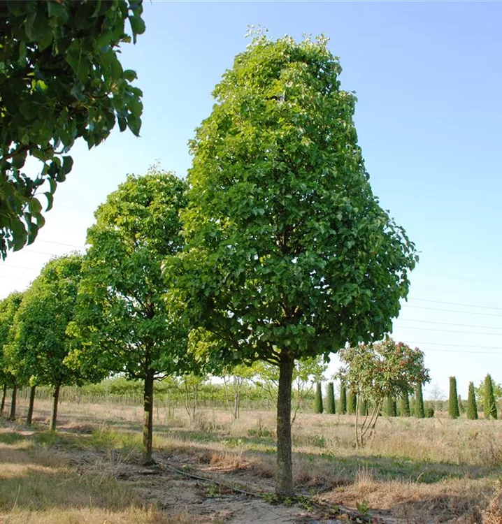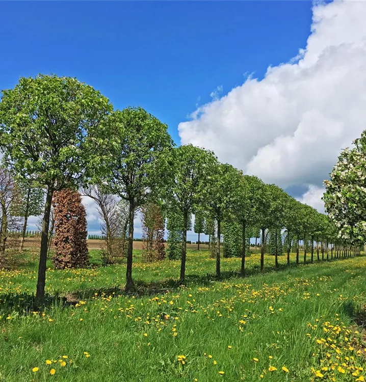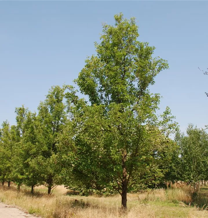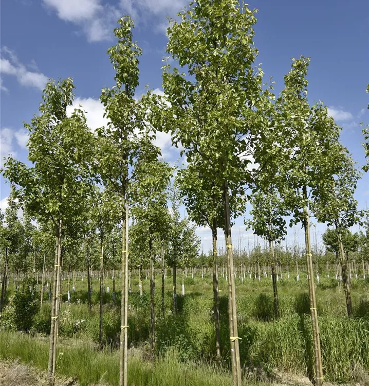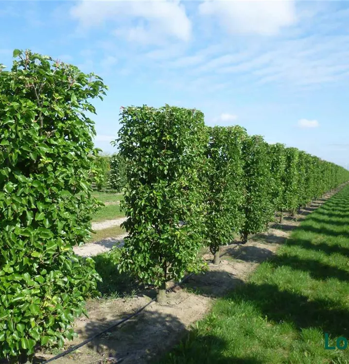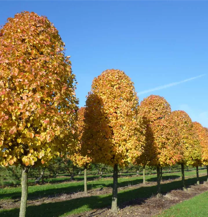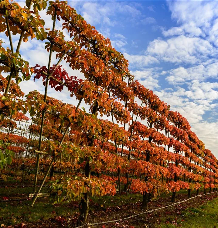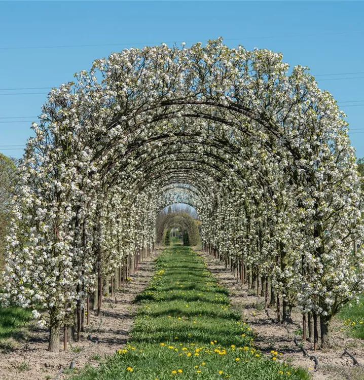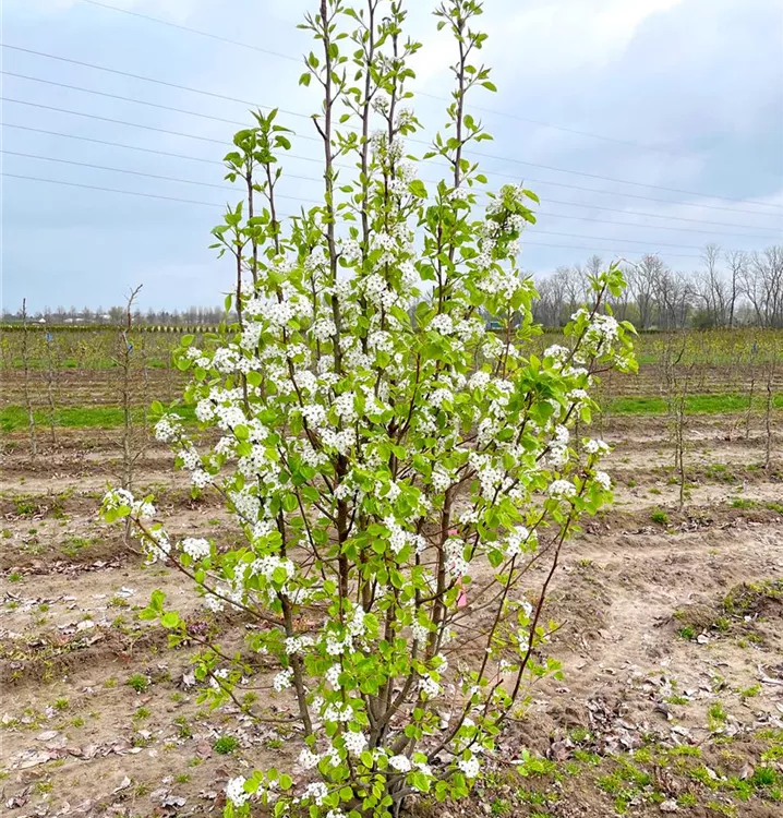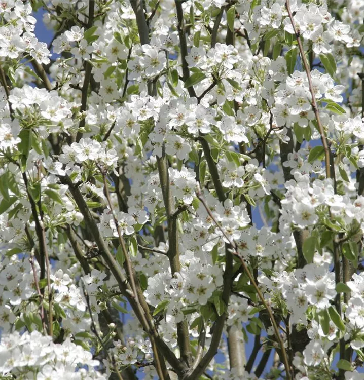 The Callery pear 'Chanticleer' (Pyrus calleryana) is a conical, upright small tree that produces white flowers arranged in umbels. They appear from the end of April to the beginning of May. They produce green-brown, round fruits from August. They are small. The Callery pear 'Chanticleer' also has shiny, egg-shaped, dark green leaves. Its bark is brown and smooth. In a sunny location, it usually reaches a height of approx. 15 m and is approx. 5 m wide. The Callery pear 'Chanticleer' makes no special demands on the soil.