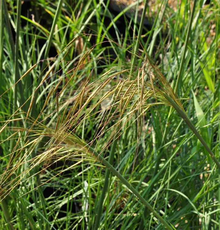 The Golden oats (Stipa gigantea) is a decorative design element in the garden, which also stands out with its upright and clump-forming growth. The golden-yellow flower panicles adorn this grass from summer onwards. It feels most at home in a sunny location with the most well-drained, loose soil possible. In favourable conditions, this hardy grass reaches a height of approx. 1.8 m and grows up to 1 m wide.
