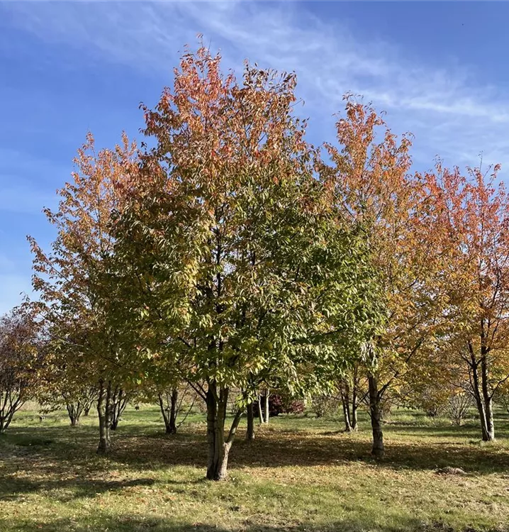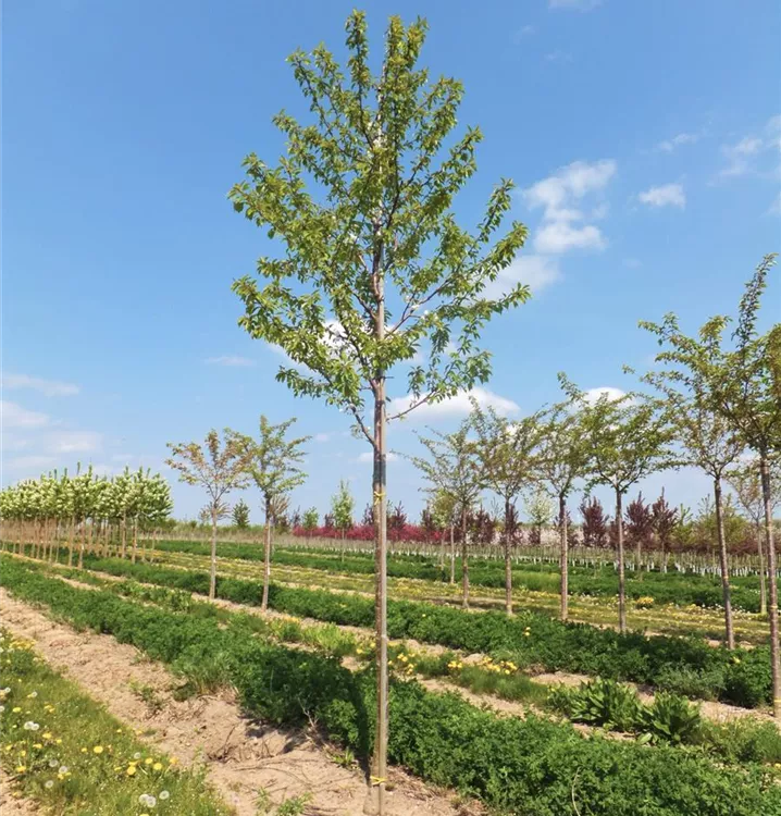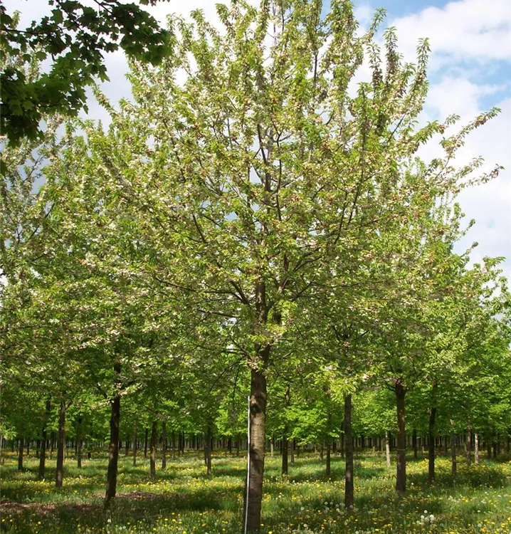 The Wild cherry 'Plena' (Prunus avium) is a roundish tree that produces white flowers with a pleasant scent. They appear from April to May. The Wild cherry 'Plena' also has egg-shaped, medium green leaves. Its bark is red-brown, smooth and shiny. In a sunny to semi-shady, wind-protected location with well-drained, calcareous, nutrient-rich soil, it usually reaches a height of around 10 metres and is around 6 metres wide.