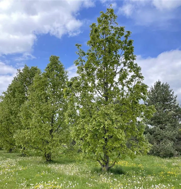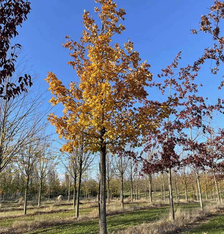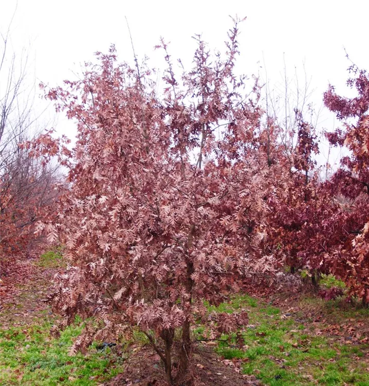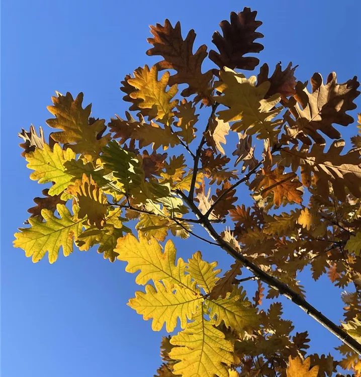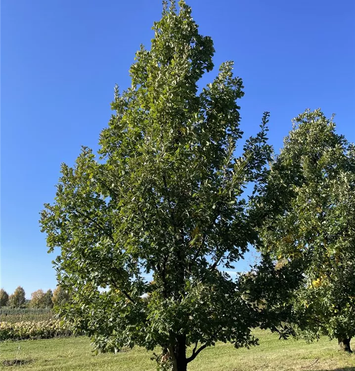 These produce light brown, oval fruits. The Hungarian oak also bears egg-shaped, dark green leaves. Its bark is grey and smooth. In a sunny location with well-drained, nutrient-rich, loamy soil, it usually reaches a height of around 20 metres and grows to a width of around 15 metres.