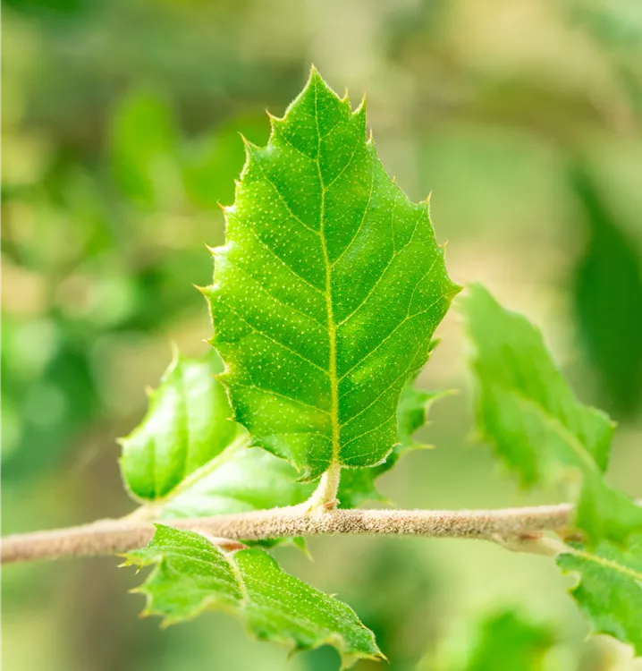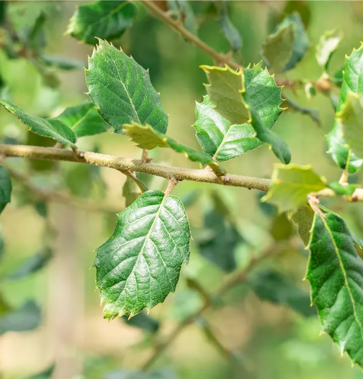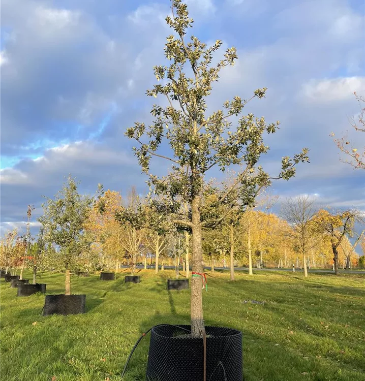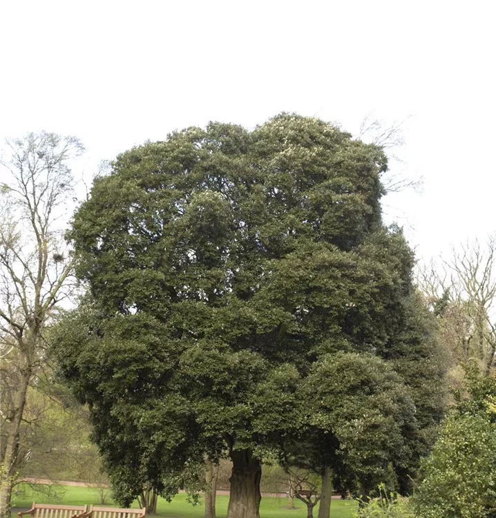 The Holm oak (Quercus ilex) is a spherical small tree with decorative, grey-green, oval fruits. It produces creamy white flowers arranged in catkins from April to May. The Holm oak also has leathery, egg-shaped, dark green leaves. In a sunny, sheltered location with well-drained, nutrient-rich soil, it usually reaches a height of around 12 metres and grows to a width of around 9 metres.