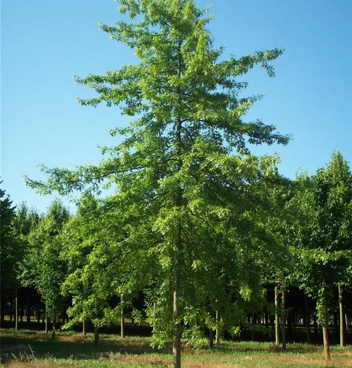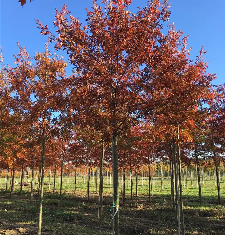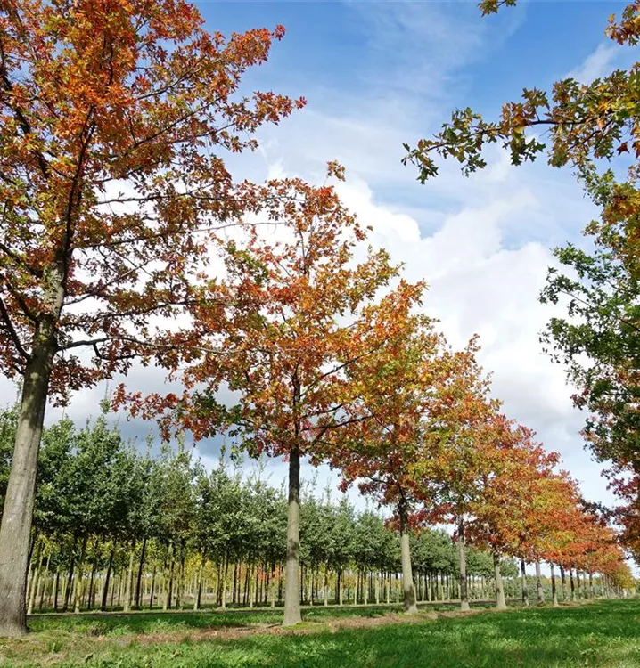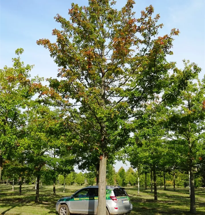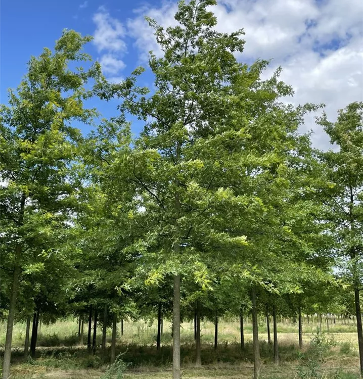 The Pin oak (Quercus palustris) is a conical, loose tree with decorative, brown, round fruits. It produces green flowers this year. The Pin oak also has roundish, dark green leaves. In a sunny location, it usually reaches a height of around 25 metres and is around 15 metres wide. The Pin oak makes no special demands on the soil.