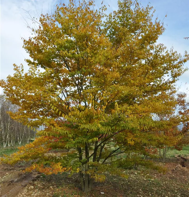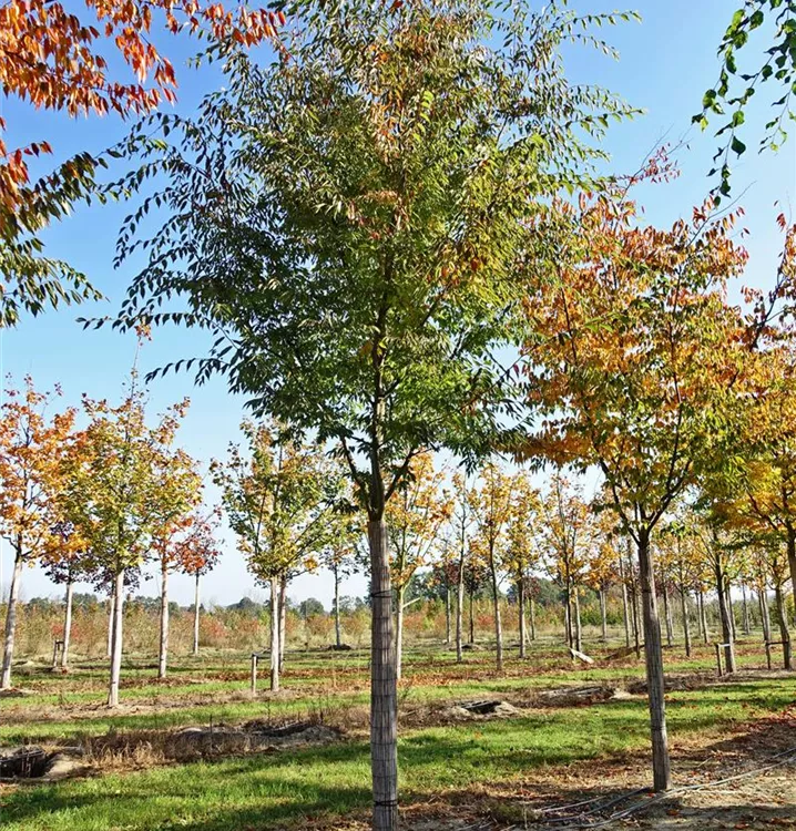 The Japanese Zelkova (Zelkova serrata) is a sprawling, broad, large tree that produces green-brown flowers. They appear from April to May. The Japanese Zelkova also has pinnate, dark green leaves. Its bark is gray and scaly. In a sunny to semi-shady location with nutrient-rich soil, it usually reaches a height of around 25 m and is around 22 m wide.
