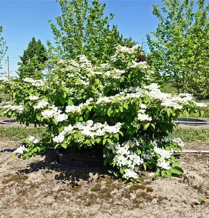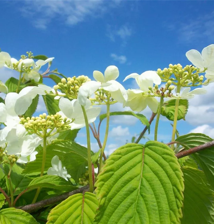 The Japanese snowball (Viburnum plicatum) is an upright, spreading shrub that produces white flowers arranged in umbrella clusters with a strong fragrance. They appear from May to June. These produce black-red fruits. They exude a strong fragrance. The Japanese snowball also has egg-shaped, medium-green leaves. In a sunny to semi-shady location with humus-rich, nutrient-rich soil, it usually reaches a height of around 3 metres and grows to around 3 metres wide.