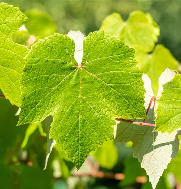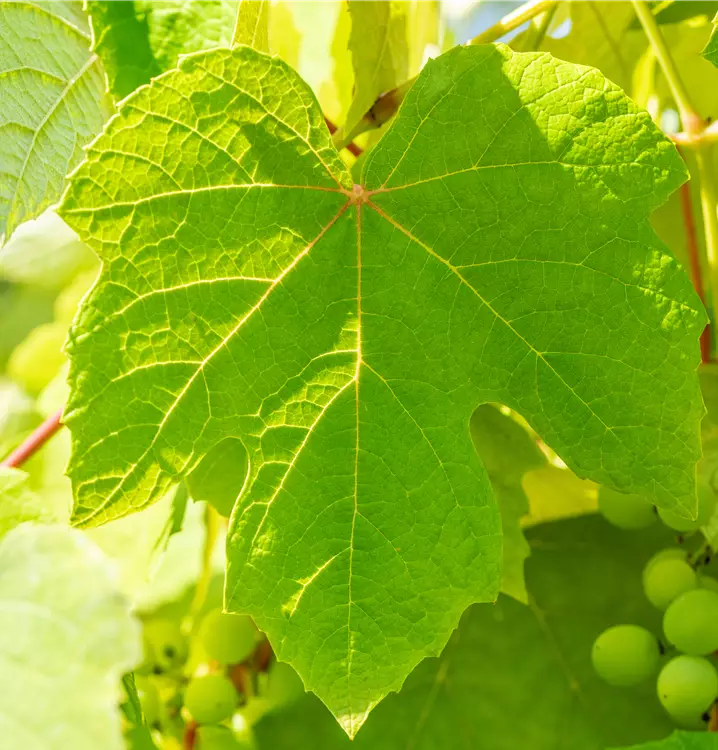 The Common grape vine 'Muscat Bleu' (Vitis vinifera) produces dark blue fruits. They are oval and have a sweet-sour, tangy flavour. Well-drained, nutrient-rich, sandy soil and a sunny to semi-shady location create the ideal conditions for a high-yielding harvest from mid-September. Its yellow-green, slightly fragrant flowers are a beautiful sight. With its climbing habit, the Common grape vine 'Muscat Bleu' grows to around 10 metres high and 10 metres wide.