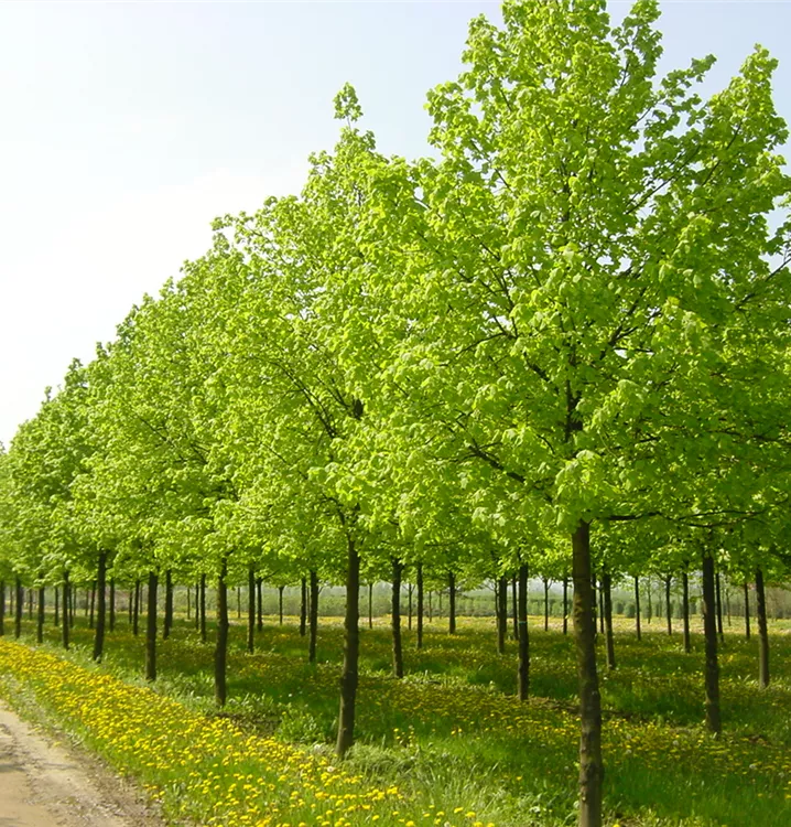 The Common lime 'Pallida' (Tilia x vulgaris) is a large conical tree that produces pale yellow flowers arranged in umbels with a pleasant fragrance. They appear from June to July. They produce grey-green, round fruits from September. They exude a pleasant fragrance. The Common lime 'Pallida' also has shiny, heart-shaped, dark green leaves. Its bark is grey. In a sunny location with well-drained, nutrient-rich soil, it usually reaches a height of around 40 metres and grows to a width of around 20 metres.
