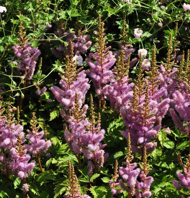 The Chinese astilbe (Astilbe chinensis var. pumila) is a runner-forming, compact, creeping perennial that produces pink-coloured flowers arranged in panicles from August to September. Its pinnate, serrated leaves are medium green. In a sunny to semi-shady location with well-drained, nutrient-rich, sandy soil, it usually reaches a height of approx. 30 cm and is approx. 40 cm wide. The Chinese astilbe is well tolerant of frost.