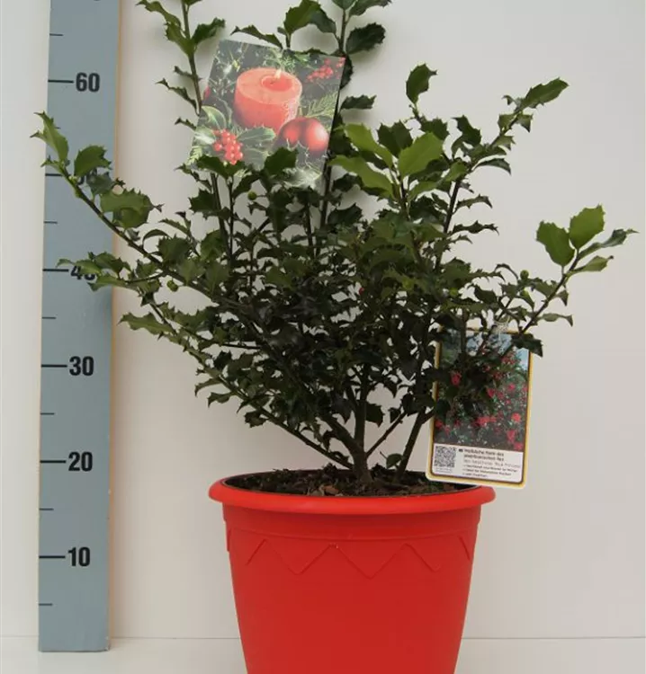 The Blue holly 'Blue Princess'® (Ilex meserveae) is an upright, dense shrub with decorative, red fruits. It produces white flowers in May. The Blue holly 'Blue Princess'® also has shiny, lanceolate, dark green leaves. In a sunny to semi-shady location with well-drained, nutrient-rich, weakly acidic soil, it usually reaches a height of approx. 2 metres and grows to a width of approx. 2 metres.