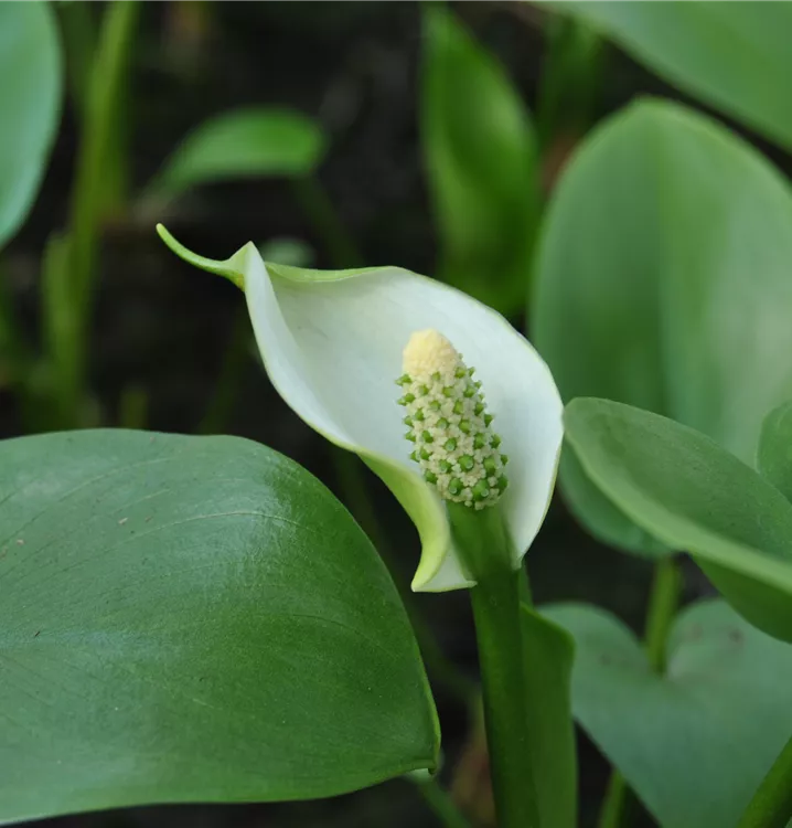 With its dark green leaves, the Bog arum (Calla palustris) is an extremely decorative aquatic plant that is particularly suitable for areas such as pond edges, streams and ponds. White flowers appear from May to June. It prefers humus-rich, lime-free soil in a sunny to semi-shady position. The Bog arum is well tolerant of frost. The upright, rhizome-forming plant usually reaches a height of approx. 30 cm.