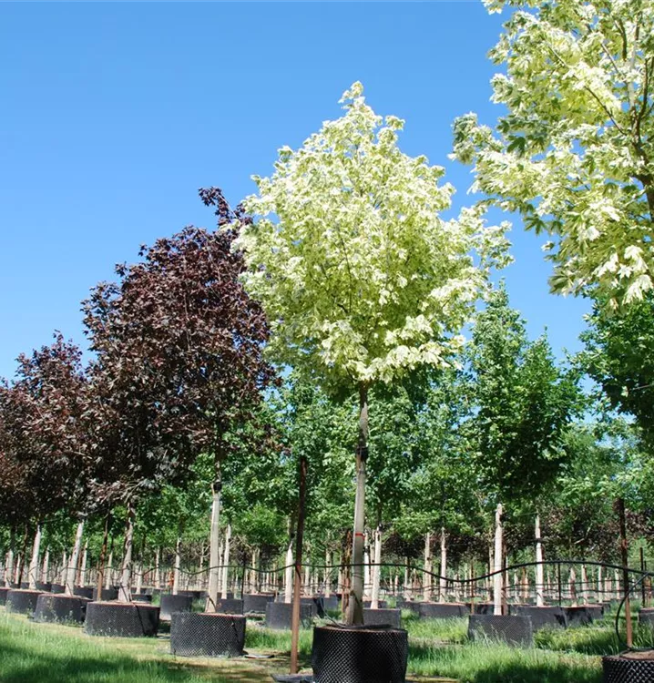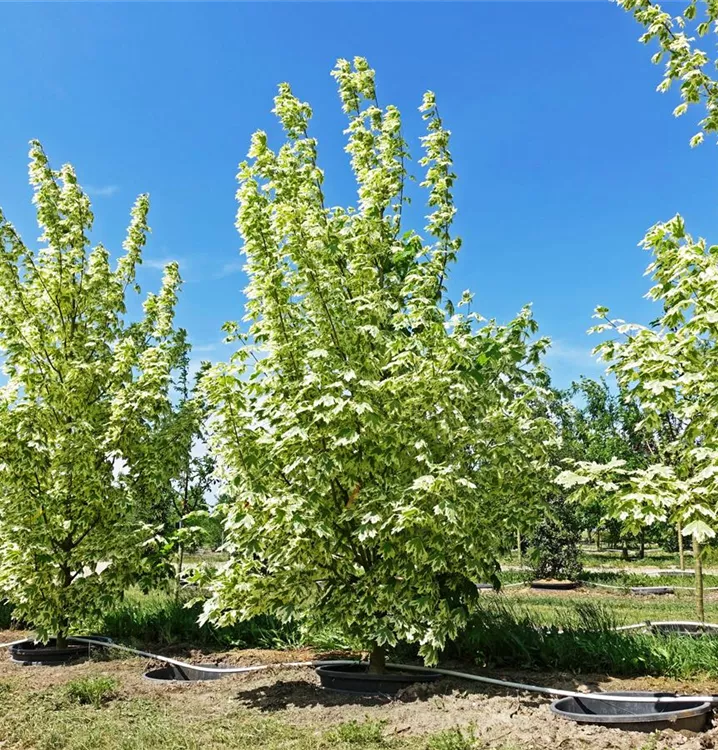 The Norway maple 'Drummondii' (Acer platanoides) is a dense, pyramidal, deciduous small tree with decorative, light green leaves with a white margin. The light pink-coloured shoots are also an interesting sight. It also bears greenish-yellow flowers arranged in umbels from April to May. In a sunny to semi-shady location, it usually reaches a height of around 12 metres and is around 9 metres wide. The Norway maple 'Drummondii' makes no particular demands on the soil.