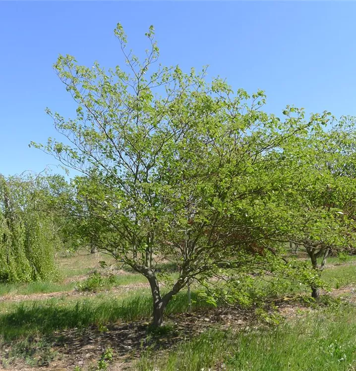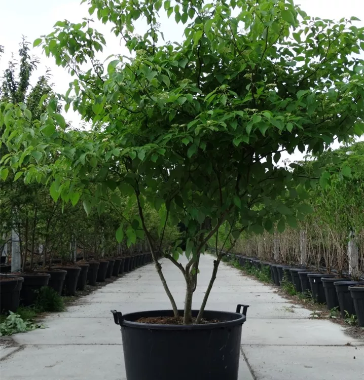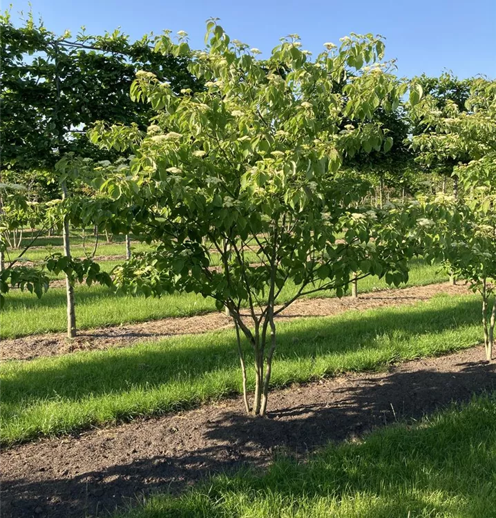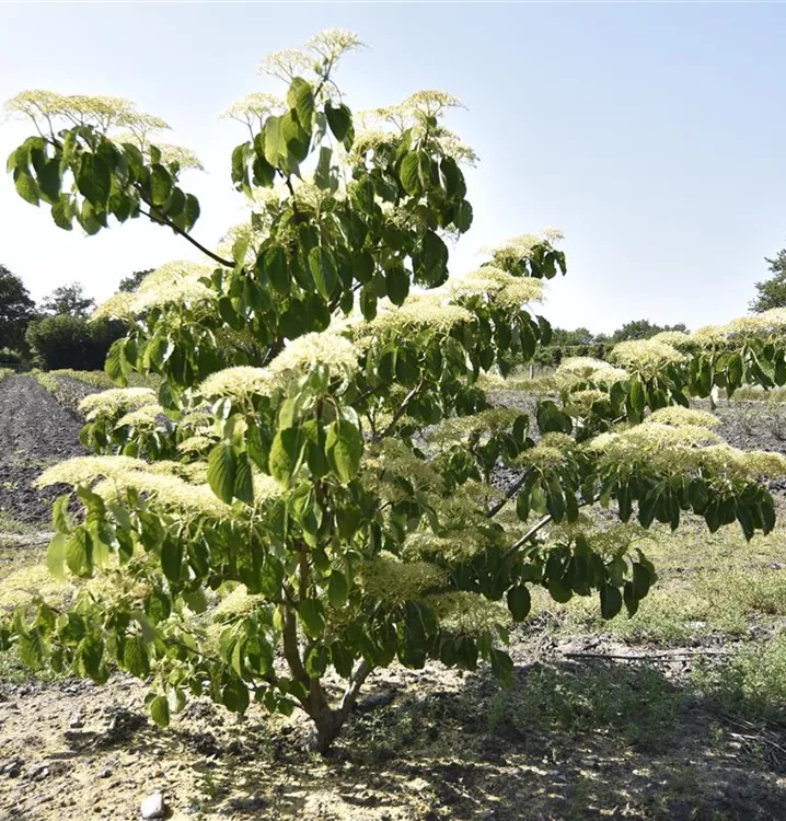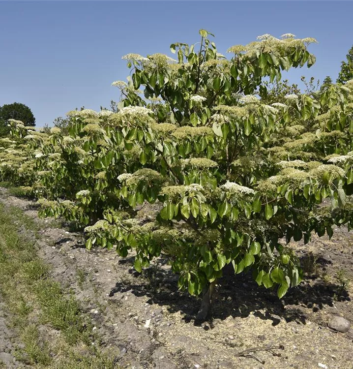 The Pagoda dogwood (Cornus alternifolia) is a spreading, broad, large shrub that produces creamy white flowers arranged in umbrella clusters with a strong fragrance. They appear from May to June. They produce black, round fruits from August. They exude a strong fragrance. The Pagoda dogwood also has egg-shaped, dark green leaves. Its bark is dark grey. In a sunny to semi-shady location with well-drained, humus-rich, acidic soil, it usually reaches a height of around 6 metres and grows to a width of around 5 metres.