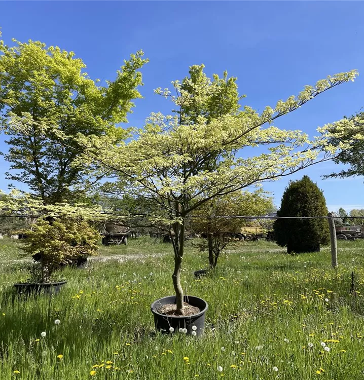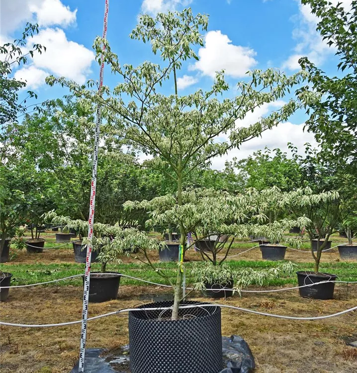 The Giant dogwood 'Variegata' (Cornus controversa) is a large conical shrub with decorative, black-blue fruits. It produces creamy white flowers arranged in umbrella clusters from May to July. The Giant dogwood 'Variegata' also has egg-shaped, dark green leaves with a white edge. The green-yellow shoots are also an interesting sight. In a sunny to semi-shady location with well-drained, nutrient-rich soil, it usually reaches a height of around 6 metres and grows to around 4 metres wide.
