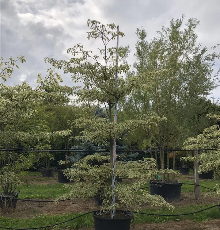 Giant dogwood 'Variegata' is a large shrub that grows in a conical shape. It usually reaches a height of 4 - 6 m and is approx. 3 - 4 m wide. It usually grows 20 - 30 cm per year.