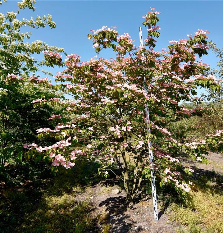 The Kousa 'Satomi'® (Cornus kousa) is a large, upright shrub with decorative, dark pink, round fruits. It produces pink flowers from the end of May to June. The Kousa 'Satomi'® also has egg-shaped, medium-green leaves. In a sunny to semi-shady location with well-drained, humus-rich, lime-free, sandy soil, it usually reaches a height of around 6 metres and grows to a width of around 5 metres.