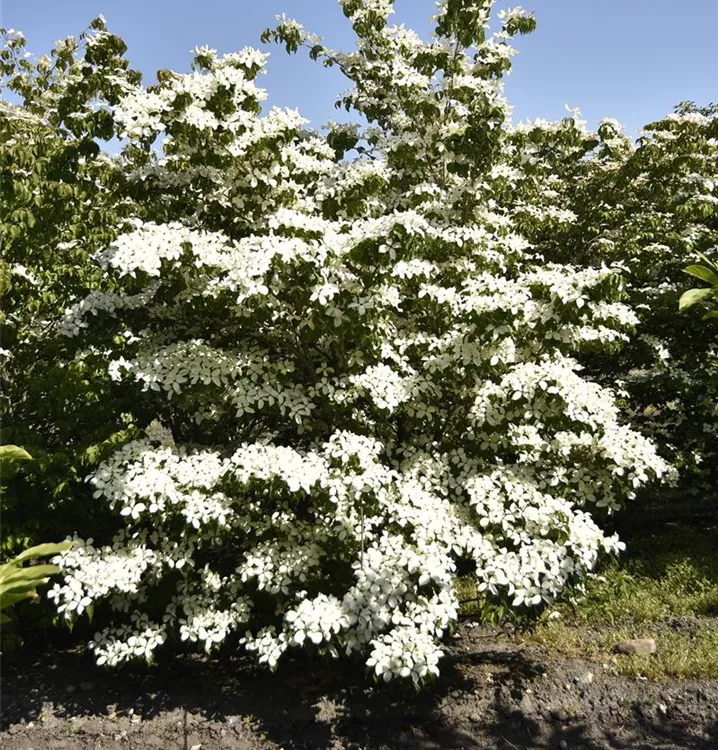 The Kousa 'Venus'® (Cornus kousa) is an upright, spreading large shrub that produces white flowers. They appear from May to June. The Kousa 'Venus'® also has egg-shaped, medium-green leaves. In a sunny to semi-shady location with well-drained, humus-rich, lime-free, sandy soil, it usually reaches a height of around 6 metres and grows to a width of around 3 metres.
